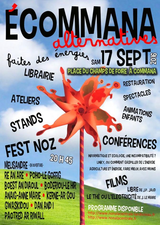 L’association « Commana Dit Non à la Centrale » organise, avec le soutien d’autres associations locales et le collectif Gaspare, le samedi 17 septembre 2016 à partir de 10 heures à Commana, la troisième édition d’ÉCOMMANA alternatives – faites des énergies, avec conférences, stands et ateliers, spectacles, animations enfants, restauration le midi, buvette.