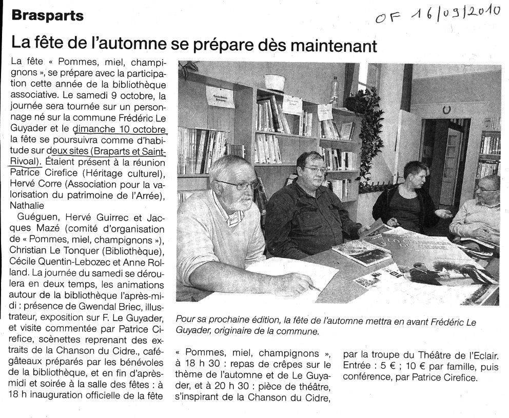 Article d’Ouest-France, Brasparts jeudi 16 septembre 2010