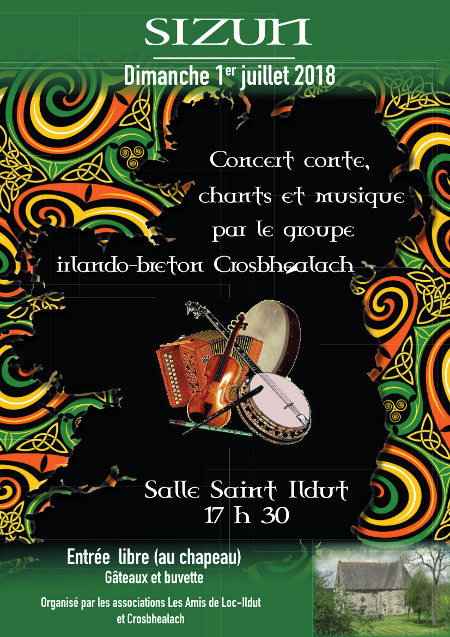 En ce début d’été, l’association Les Amis de Loc-Ildut et le groupe Crosbhealach vous invitent à une soirée aux couleurs de l’Irlande : une dizaine de musiciens et chanteurs irlando-bretons (Henri Appéré : fiddle, Philippe Arlaux : uilleann pipes, Richard Bloom : guitare, Stéphane Charles : bouzouki, Judy Connolly + Ciaran Kelly : chant, Patricia Lynch : accordéon, Dominique Le Moigne : tin whistle, Andromeda Mc Gregor : saxophone, Bertrand Roux pour les textes) ont concocté un spectacle d’un genre particulier : le concert conté, qu’ils sont heureux de vous proposer le 1er juillet pour fêter, entre autres, le début de l’été.