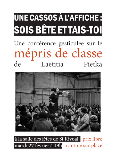 À la frontière du one woman show, à partir de son expérience personnelle, Laetitia Pietka dénonce les stéréotypes sur les classes populaires. Des stéréotypes qui gangrènent la société entière (école, médecine, etc) et dont les conséquences dépassent le domaine économique. Avec un mélange d’humour, de gravité, de légèreté, de profondeur, elle partage un peu de notre histoire populaire (oubliée et/ ou désappropriée). Comment lutter et reprendre le pouvoir ! ça a l’air sérieux, mais on rigole bien aussi !