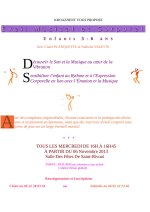 Vous trouverez en Document-joint le descriptif de cet atelier d’éveil musical et corporel qui sera animé par Nathalie Valette et Claire Planquette le mercredi après-midi de 16 h à 16h45 à partir du mercredi 6 Novembre prochain à la salle des fêtes de Saint Rivoal.