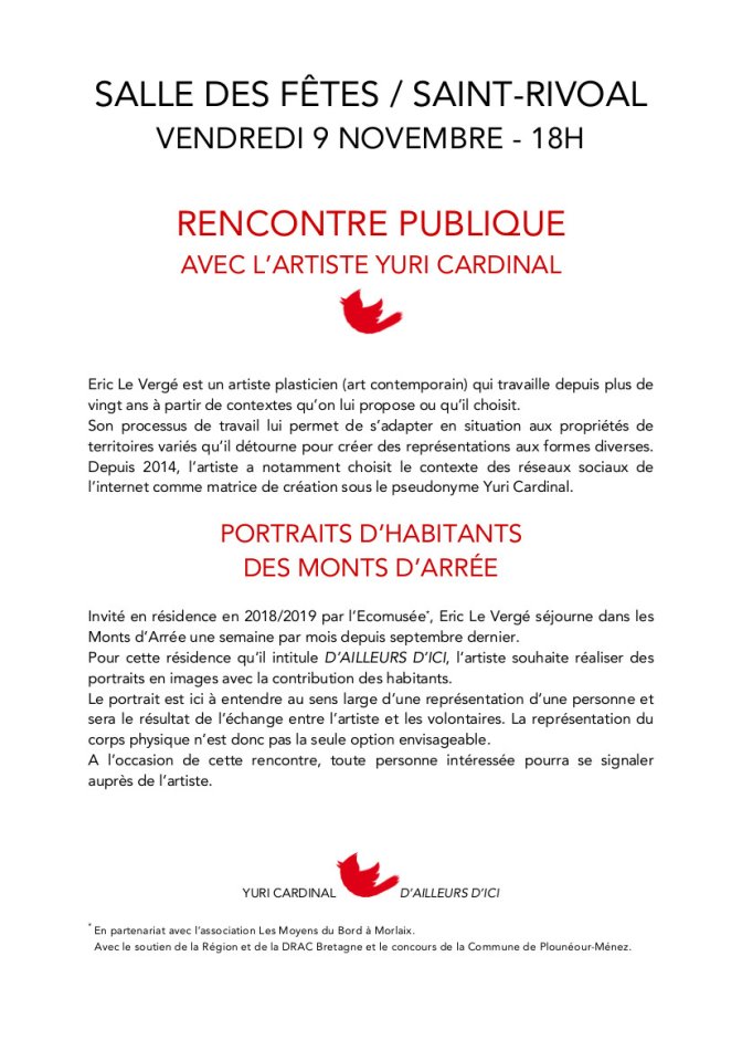Nous organisons une réunion publique le 9 novembre à la salle des fêtes de Saint-Rivoal pour présenter le projet d’Eric Le Vergé, l’artiste en résidence.