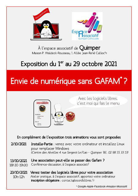 L’association Les Ordis Libres présente son exposition « Envie de numérique sans Gafam ? » à l’Espace associatif de Quimper jusqu’au 29 octobre.