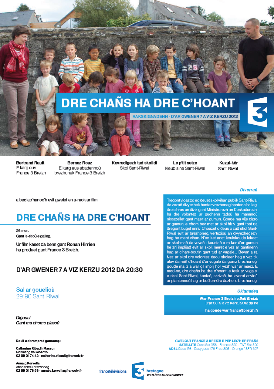 Diskouezet e vo "Dre chañs ha dre c’hoant" d’ar 7 a viz Kerzu e Sant-Riwal (araok bezañ diskouezet e Bali Breizh, war France 3 Breizh d’an 9 a viz Kerzu da 11e).