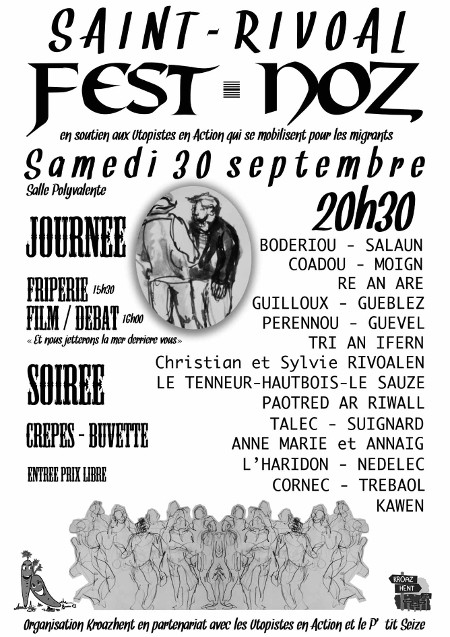 - Et enfin, à partir de 20h30, entrée prix libre, le fest-noz, avec une très belle affiche, tous les artistes se produiront sur scène bénévolement, pour la cause des migrants-migrantes :