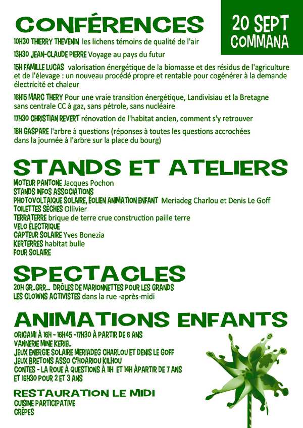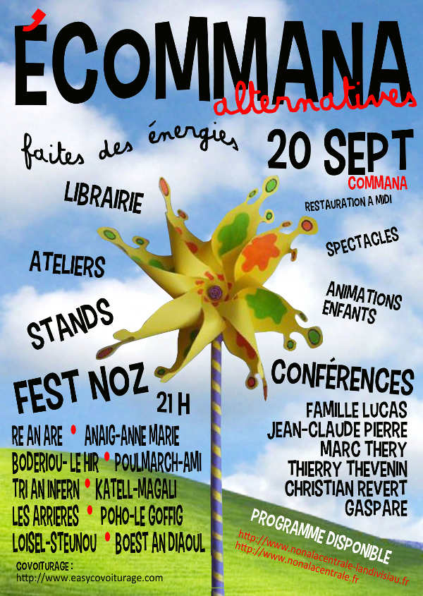 en collaboration avec les associations de Landivisiau, Sizun, Loc Mélar, Saint Sauveur, Plounéour Ménez, opposées au projet de centrale à cycle combiné gaz de Landivisiau, ainsi qu’avec l’association Vivre dans les Monts d’Arrée et le collectif Gaspare, organise une fête "Ecommana alternatives, Faites des énergies" le 20 septembre à partir de 10h, au bourg de Commana.