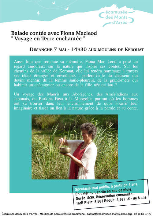 - Dimanche 7 mai à 14h30 aux moulins de Kerouat : Balade contée avec la conteuse écossaise Fiona Macleod. Un voyage autour du monde, le long du "chemin du paysan" nouvellement ouvert sur le site.