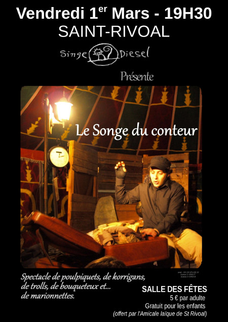 L’amicale laïque de St Rivoal est ravie de vous inviter à la représentation du spectacle de conte et de marionnettes, le Songe duconteur, de la compagnie Singe Diesel !