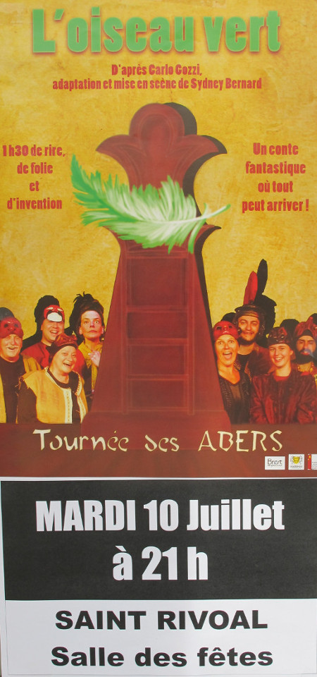 Mise en scène par Sydney Bernard, la tournée des Abers souhaite dépoussiérer la farce italienne en présentant cette année " L’Oiseau Vert de Carlos Gozzi, farce fantasmagorique, décapante et impertinente, dans la pure lignée de la " commedia dell’arte". La jeune troupe brestoise interprète avec enthousiasme et finesse ce spectacle délirant. Les changements de décors à vue participent à une mise en scène enlevée et créative.